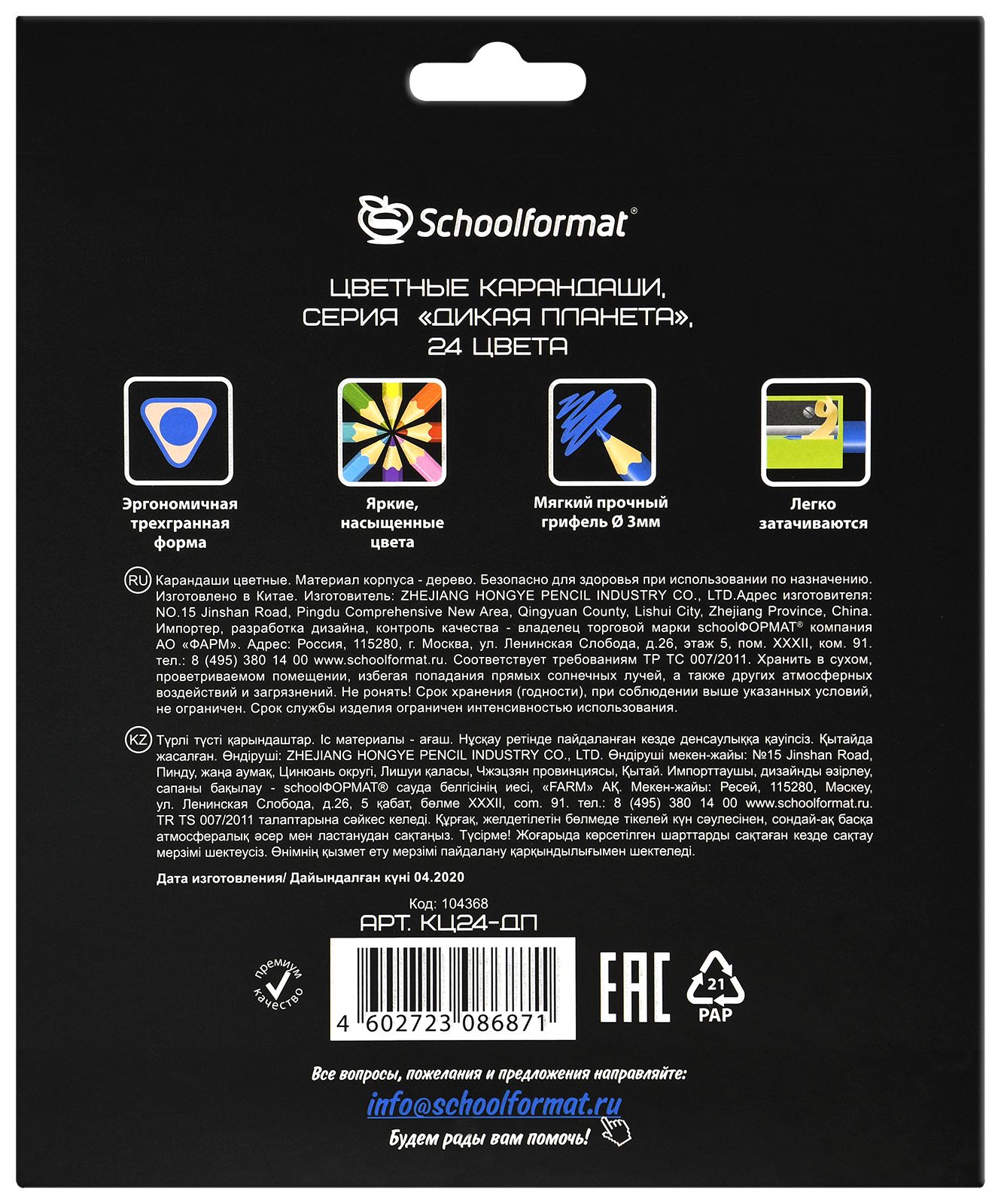 Материал: дерево Количество цветов: 24 Наличие европодвеса: Да Упаковка: картонная упаковка Мягкость грифеля: 8В Вид товара: Набор цветных карандашей Мин. партия и варианты упаковок: 1 / 12 / 144 Набор цветных карандашей Schoolformat ДИКАЯ ПЛАНЕТА 24 цвета, трехгранные, повышенная мягкость, увеличенный диаметр грифеля