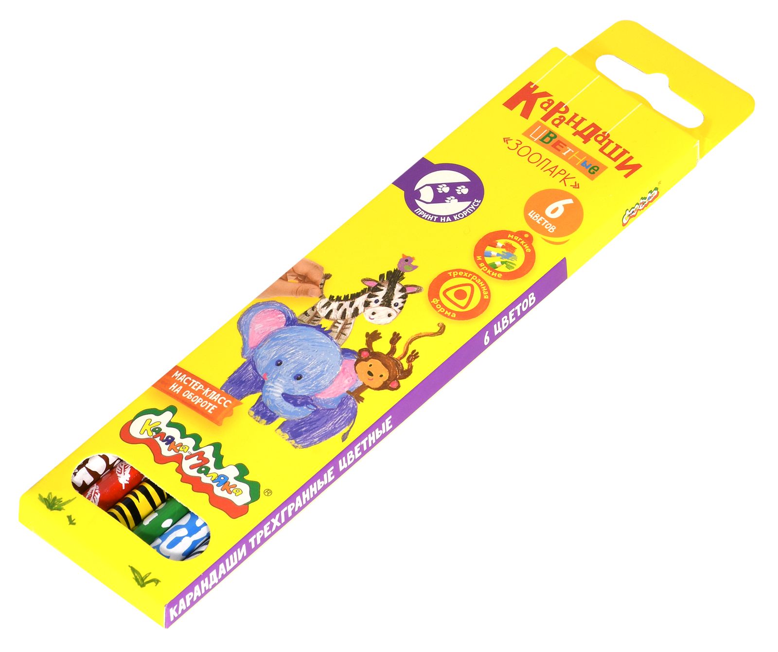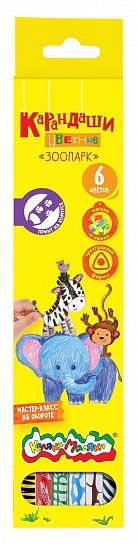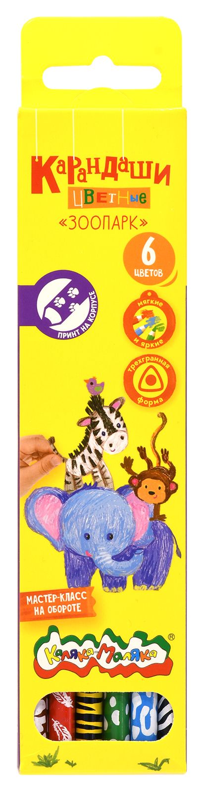 Материал: дерево Количество цветов: 6 Наличие европодвеса: Да Упаковка: картонная упаковка Мягкость грифеля: 6М Вид товара: Набор цветных карандашей Мин. партия и варианты упаковок: 1 / 24 / 480 Набор цветных карандашей Каляка-Маляка ЗООПАРК 6 цв. трехгранные, деревянные, принт на корпусе, в картонной упаковке