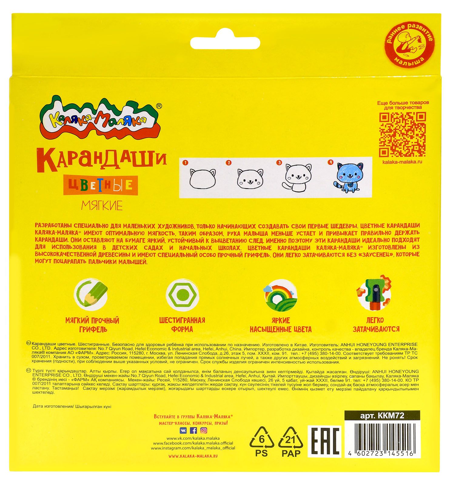 Материал: дерево Количество цветов: 72 Наличие европодвеса: Да Упаковка: картонная упаковка Мягкость грифеля: 4М Вид товара: Набор цветных карандашей Мин. партия и варианты упаковок: 1 / 3 / 24 Набор цветных карандашей Каляка-Маляка 72 цв. шестигранные, деревянные, в картонной упаковке