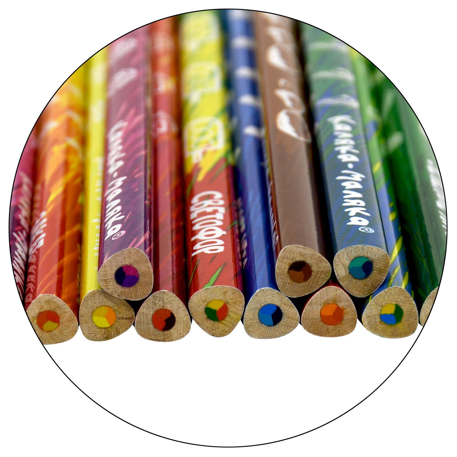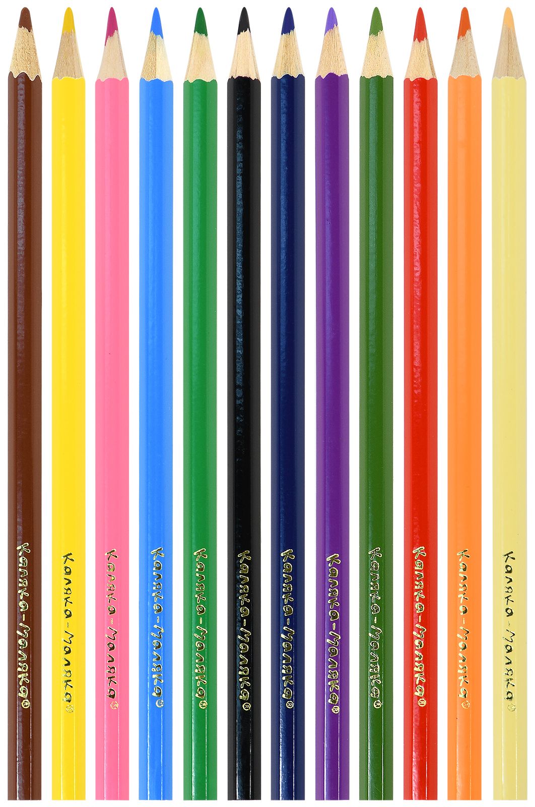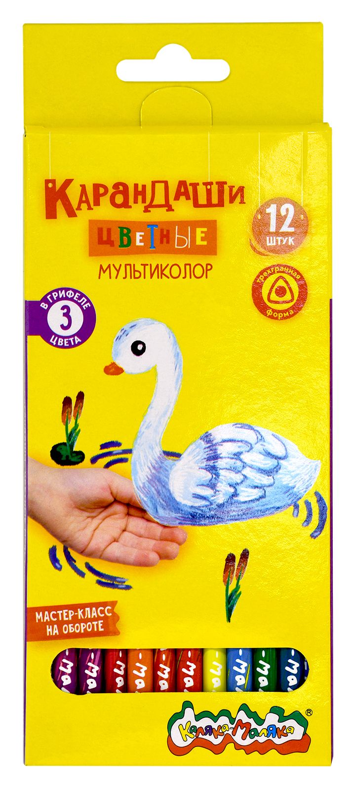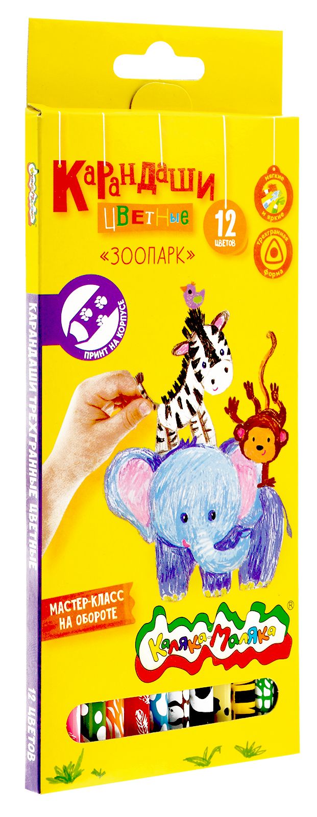 Материал: дерево Количество цветов: 12 Наличие европодвеса: Да Упаковка: картонная упаковка Мягкость грифеля: 6М Вид товара: Набор многоцветных карандашей Мин. партия и варианты упаковок: 1 / 24 / 240 Набор цветных карандашей Каляка-Маляка МУЛЬТИКОЛОР 12 шт дерево трехгранный корпус картонная упаковка принт на корпусе супермягкий грифель