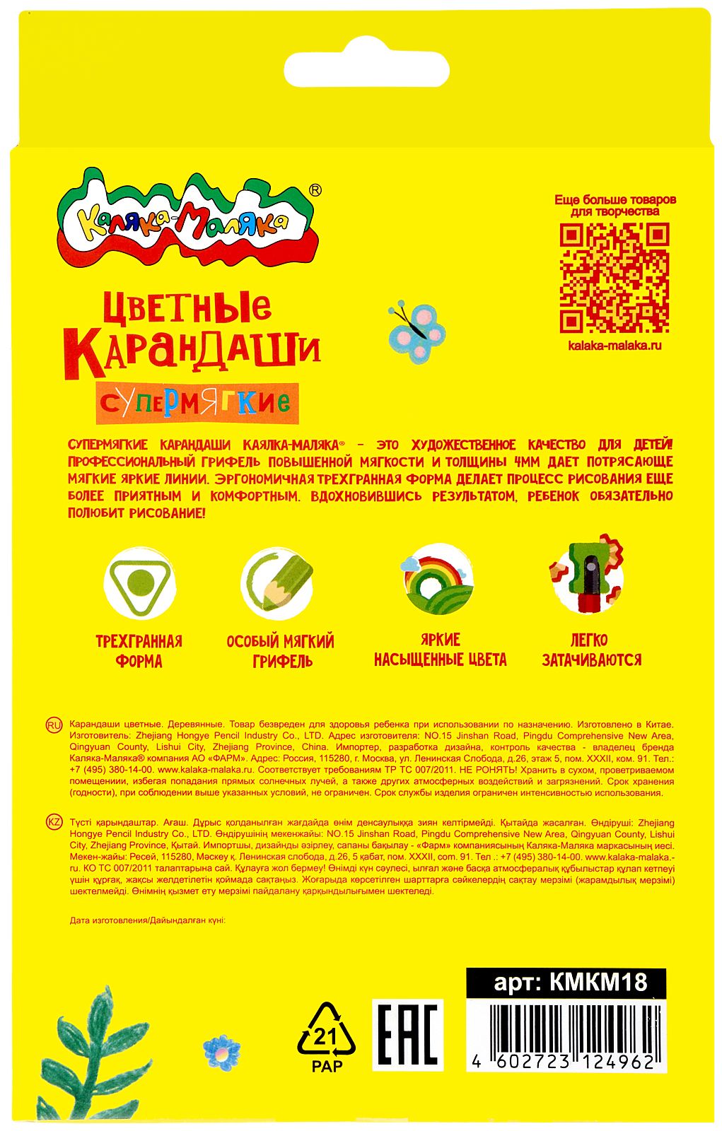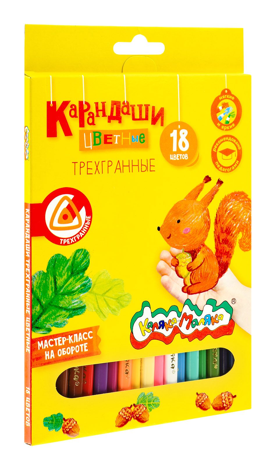 Материал: дерево Количество цветов: 18 Наличие европодвеса: Да Упаковка: картонная упаковка Мягкость грифеля: 4М Вид товара: Набор цветных карандашей Мин. партия и варианты упаковок: 1 / 8 / 160 Набор цветных карандашей Каляка-Маляка 18 цв. трехгранные, деревянные, в картонной упаковке