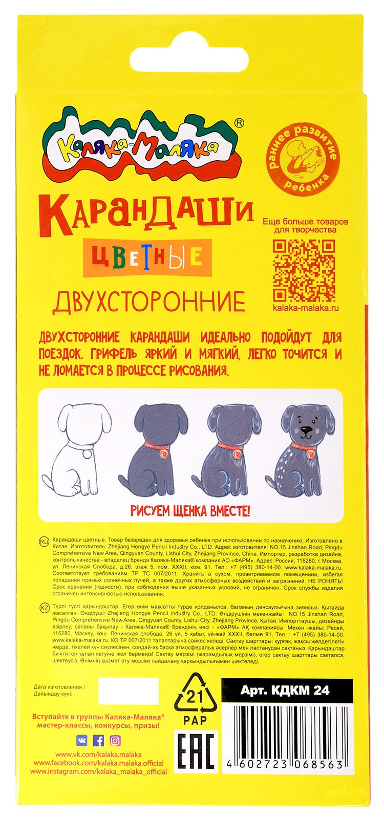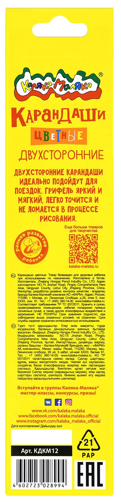 Материал: дерево Количество цветов: 12 Наличие европодвеса: Да Упаковка: картонная упаковка Мягкость грифеля: 4М Вид товара: Набор цветных карандашей Мин. партия и варианты упаковок: 1 / 24 / 480 Набор цветных карандашей Каляка-Маляка двухсторонние 12 цв. шестигранные, деревянные, в картонной упаковке