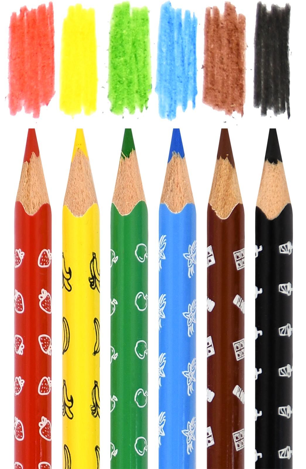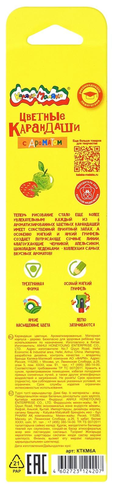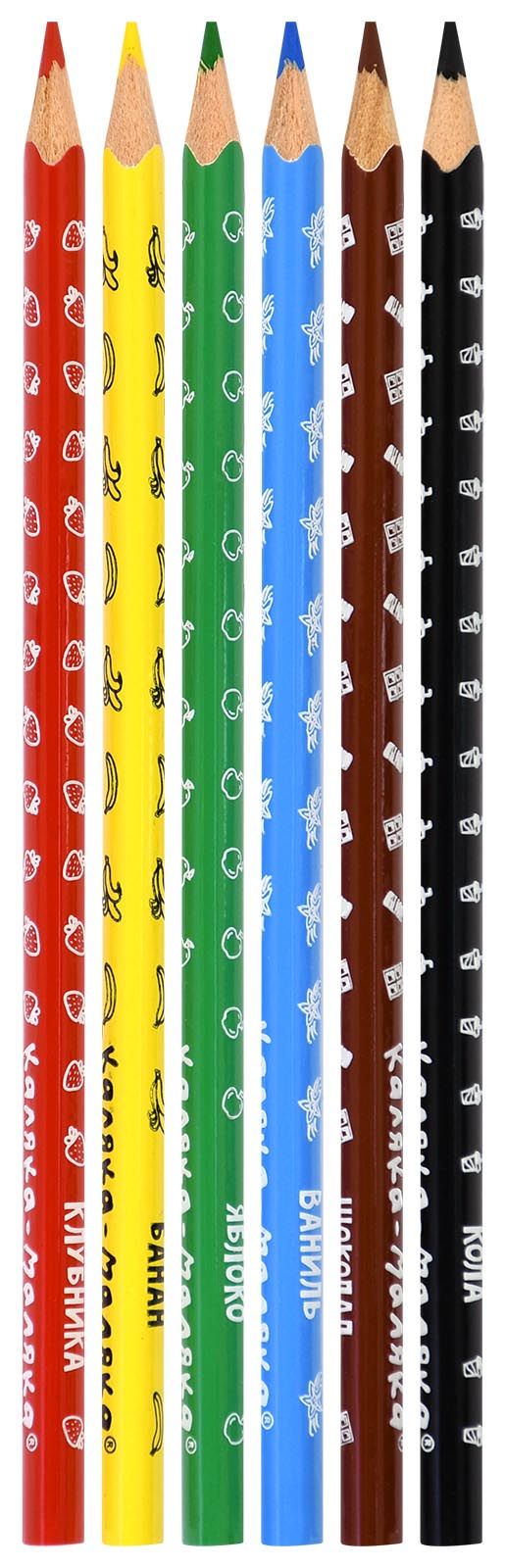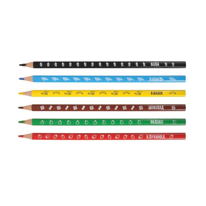 Материал: дерево Количество цветов: 6 Наличие европодвеса: Да Упаковка: картонная упаковка Мягкость грифеля: 6М Вид товара: Набор цветных карандашей Мин. партия и варианты упаковок: 1 / 24 / 480 Набор цветных карандашей Каляка-Маляка ароматизированные 6 цв. трехгранные, деревянные, принт на корпусе, супермягкий грифель, в картонной у
