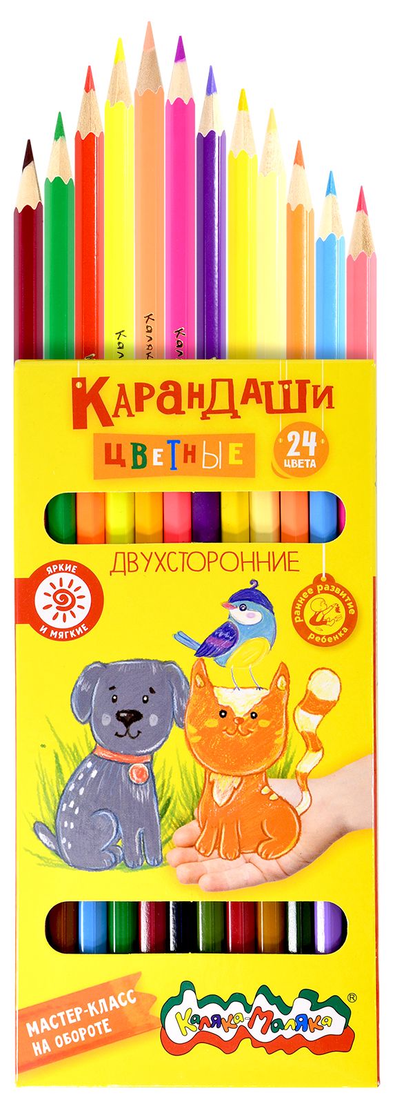 Материал: дерево Количество цветов: 24 Наличие европодвеса: Да Упаковка: картонная упаковка Мягкость грифеля: 4М Вид товара: Набор цветных карандашей Мин. партия и варианты упаковок: 1 / 12 / 240 Набор цветных карандашей Каляка-Маляка двухсторонние 24 цв. шестигранные, деревянные, в картонной упаковке