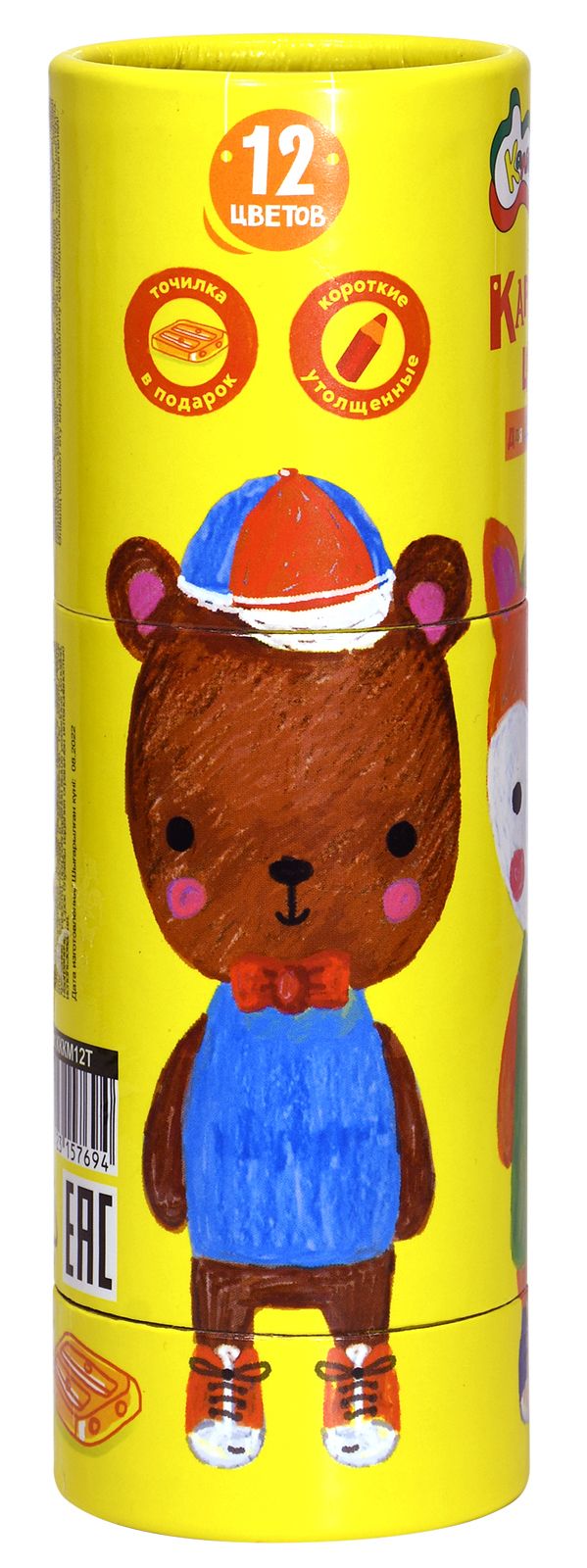 Материал: пластик Количество цветов: 12 Наличие европодвеса: Да Упаковка: тубус Мягкость грифеля: 4М Вид товара: Набор цветных карандашей Мин. партия и варианты упаковок: 1 / 12 / 144 Набор цветных карандашей Каляка-Маляка ДЖАМБО МИШКИ утолщенные, укороченные 12 цв. круглые, пластиковые, в тубусе с точилкой