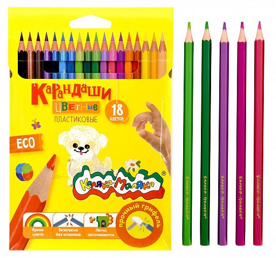 Материал: пластик Количество цветов: 18 Наличие европодвеса: Да Упаковка: картонная упаковка Мягкость грифеля: 4М Вид товара: Набор цветных карандашей Мин. партия и варианты упаковок: 1 / 8 / 96 Набор цветных карандашей Каляка-Маляка 18 цв. шестигранные, пластиковые, в картонной упаковке