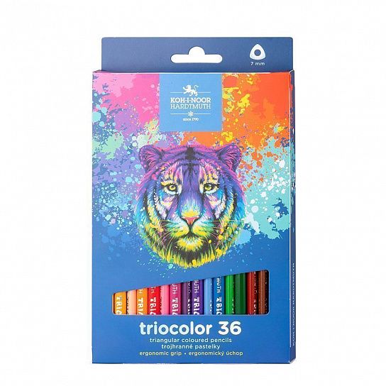 Материал: дерево Количество цветов: 36 Наличие европодвеса: Да Упаковка: картонная упаковка Мягкость грифеля: НВ Вид товара: Набор цветных карандашей Мин. партия и варианты упаковок: 1 / 20 Набор цветных карандашей Koh-I-Noor TRIOCOLOR TIGER 36 цв. трехгранные, деревянные, в картонной упаковке