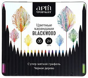 Материал: дерево Количество цветов: 24 Наличие европодвеса: Да Упаковка: металлическая коробка Мягкость грифеля: 6В Вид товара: Набор цветных карандашей Мин. партия и варианты упаковок: 1 / 6 / 72 Набор цветных карандашей АРТформат Blackwood 24 цв. трехгран. корп. дерев. метал.кор.