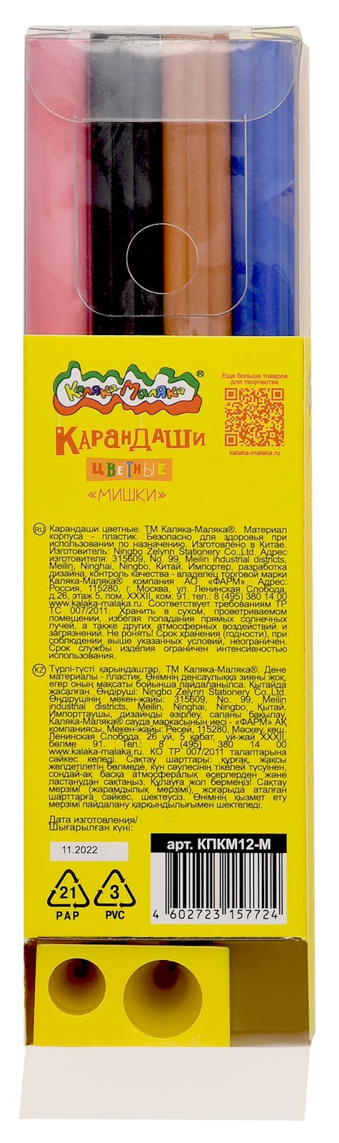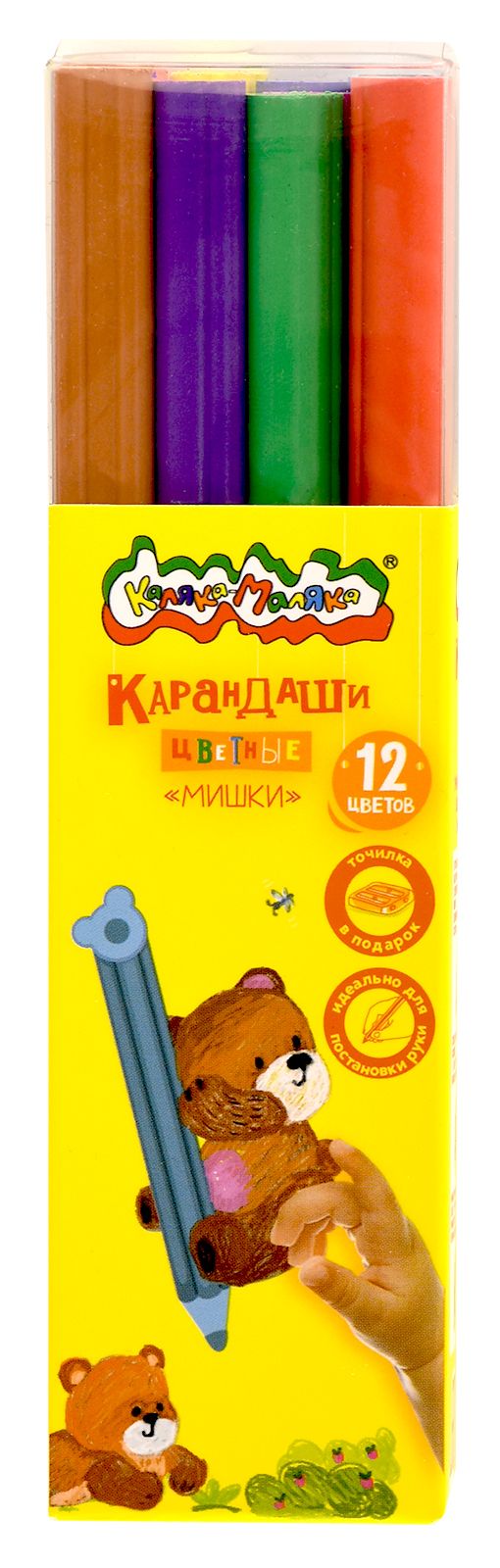 Материал: пластик Количество цветов: 12 Наличие европодвеса: Да Упаковка: тубус Мягкость грифеля: 4М Вид товара: Набор цветных карандашей Мин. партия и варианты упаковок: 1 / 12 / 144 Набор цветных карандашей Каляка-Маляка ДЖАМБО МИШКИ утолщенные, укороченные 12 цв. круглые, пластиковые, в тубусе с точилкой