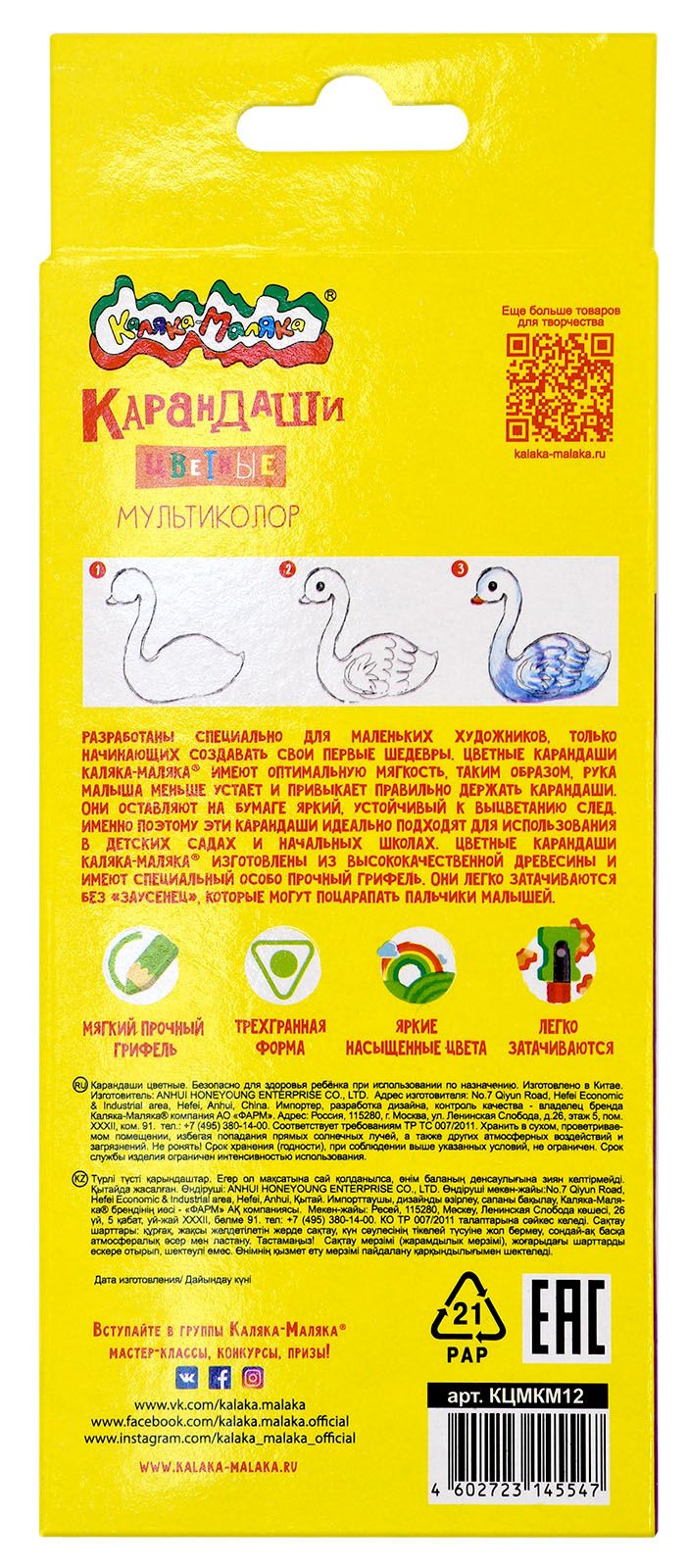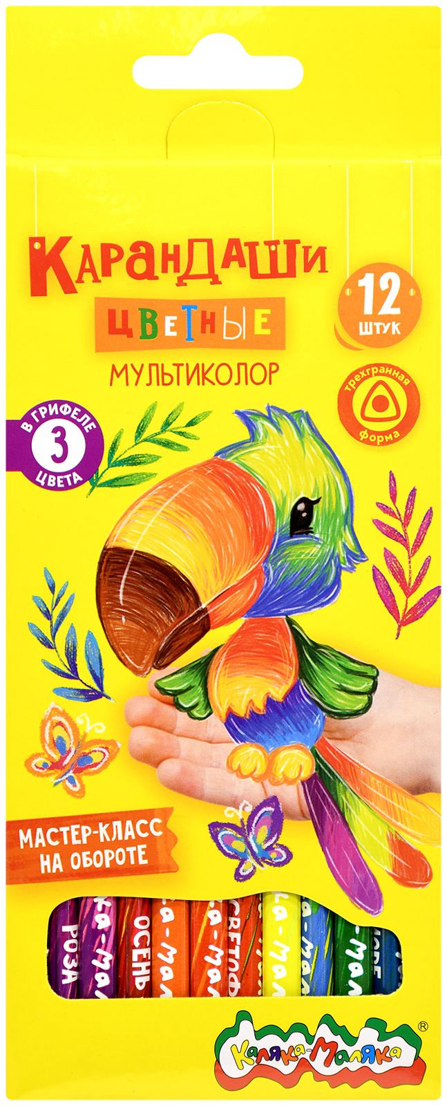 Материал: дерево Количество цветов: 12 Наличие европодвеса: Да Упаковка: картонная упаковка Мягкость грифеля: 6М Вид товара: Набор многоцветных карандашей Мин. партия и варианты упаковок: 1 / 24 / 240 Набор цветных карандашей Каляка-Маляка МУЛЬТИКОЛОР 12 шт дерево трехгранный корпус картонная упаковка принт на корпусе супермягкий грифель