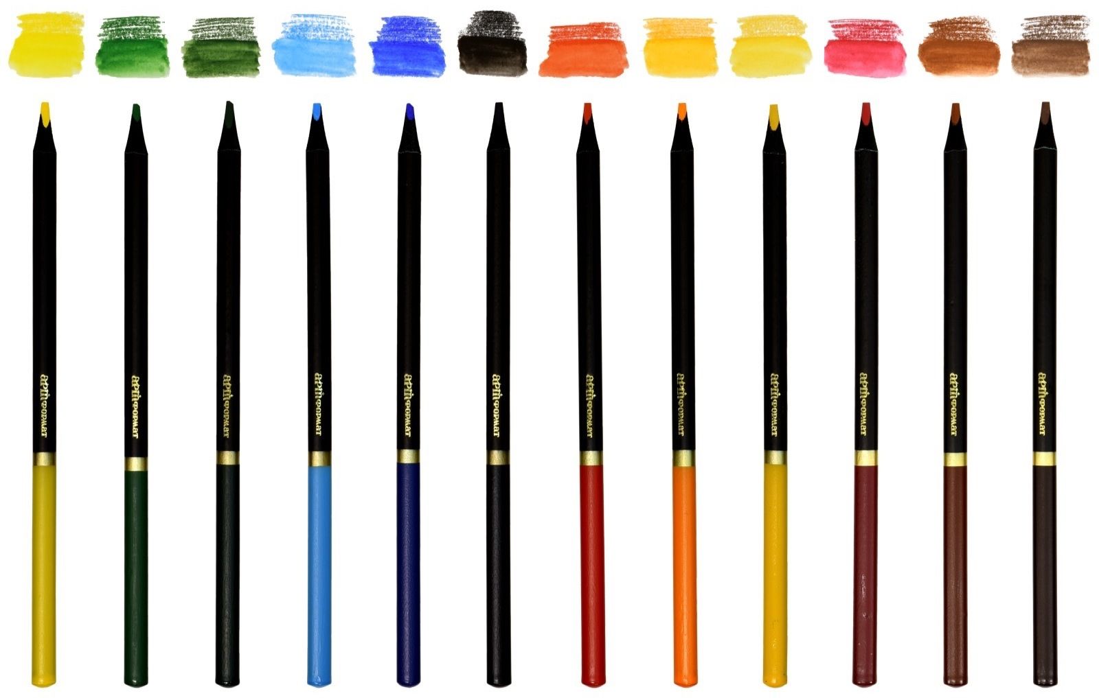 Материал: дерево Количество цветов: 12 Наличие европодвеса: Да Упаковка: картонная упаковка Мягкость грифеля: 8М Вид товара: Набор акварельных карандашей Мин. партия и варианты упаковок: 1 / 12 / 192 Набор акварельных карандашей АРТформат Blackwood 12 цв. трехгранные, деревянные, супермягкий грифель,с кистью, в картонной упаковке