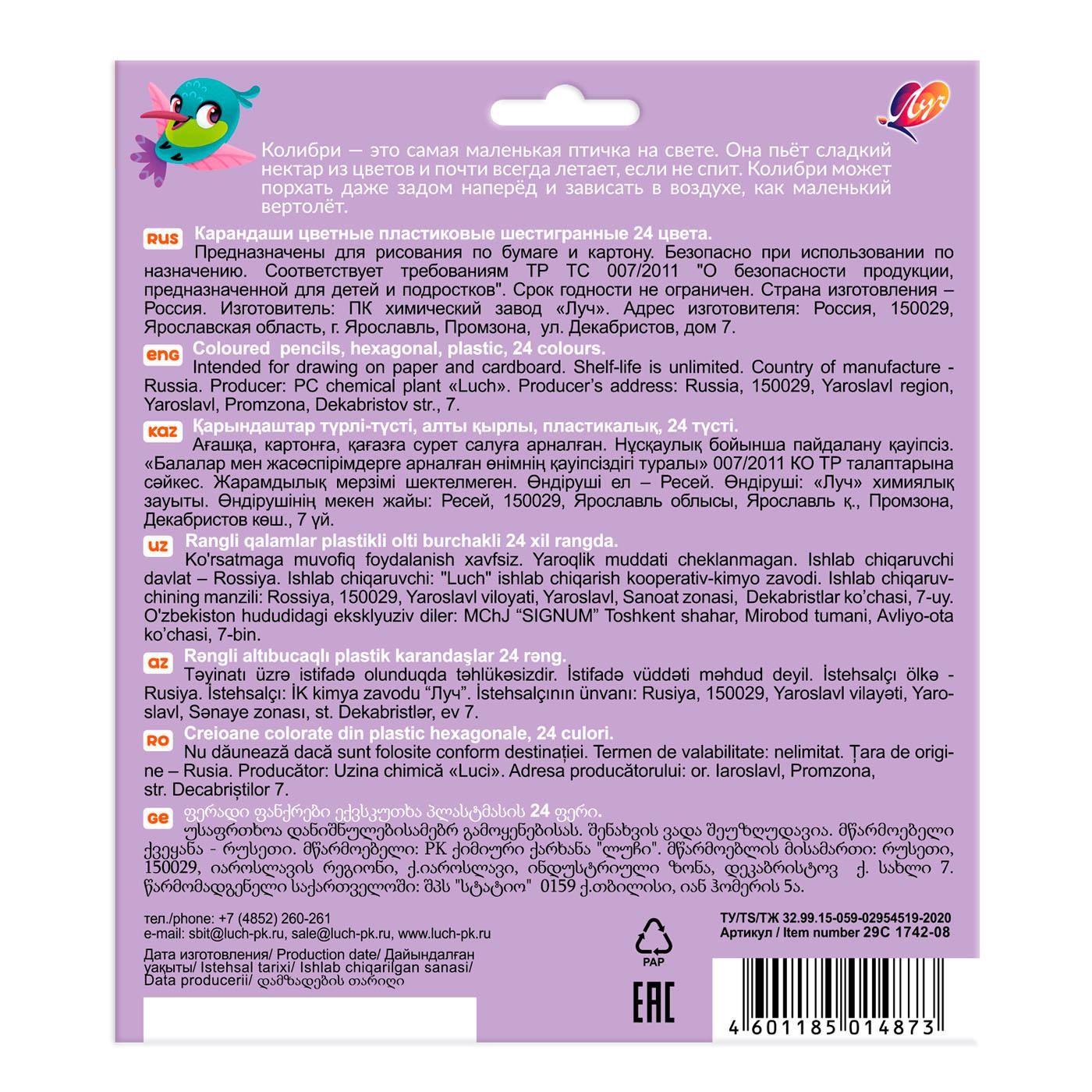 Материал: дерево Количество цветов: 24 Наличие европодвеса: Да Упаковка: картонная упаковка Мягкость грифеля: НВ Вид товара: Набор цветных карандашей Мин. партия и варианты упаковок: 1 / 12 / 180 -