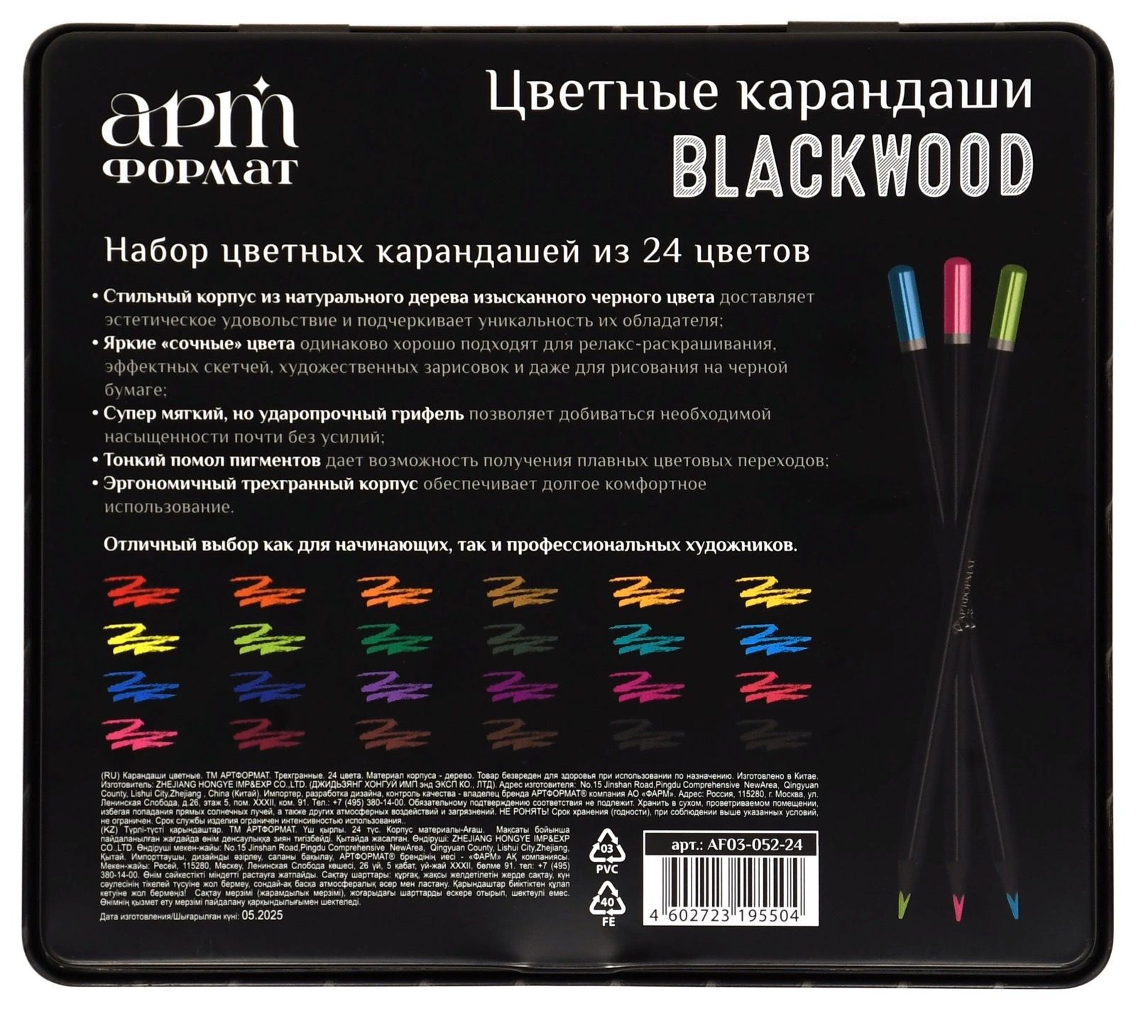 Материал: дерево Количество цветов: 24 Наличие европодвеса: Да Упаковка: металлическая коробка Мягкость грифеля: 6В Вид товара: Набор цветных карандашей Мин. партия и варианты упаковок: 1 / 6 / 72 Набор цветных карандашей АРТформат Blackwood 24 цв., трехгранные, деревянные, металлическая коробка