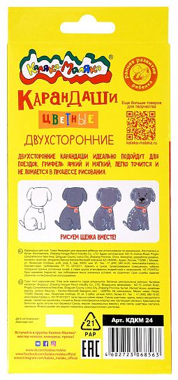 Двухсторонние карандаши — очень популярный и удобный формат! Теперь в линейке Каляка-Маляка® есть и набор 12 штук, 24 цвета! Мы обновили ключевые характеристики: увеличили диаметр грифеля, теперь он стал супермягким, добавили новые цветовые пигменты, которые делают цвета еще более яркими и сочными.