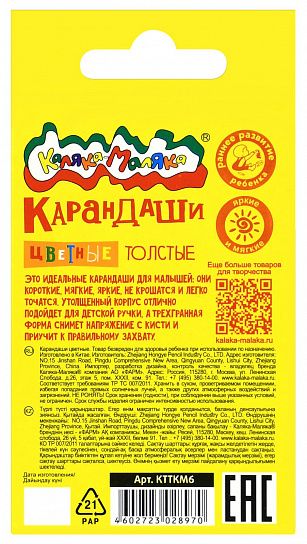 Укороченный толстый корпус карандашей Каляка-Маляка® идеально подходит для малышей. Он разработан с учетом особенности детской руки, позволяет ребенку удобно держать карандаш, облегчая усталость кисти.