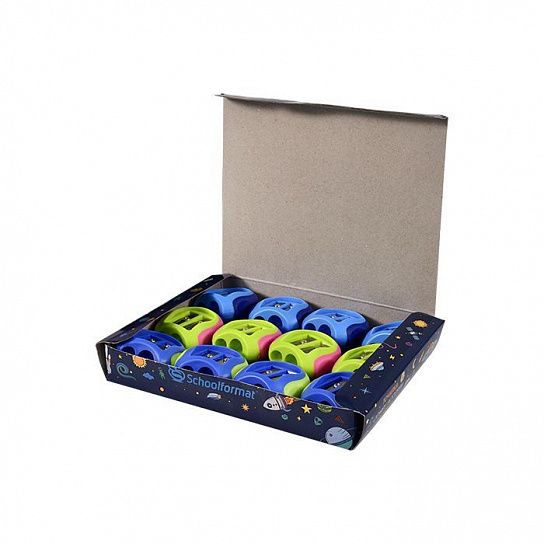 Цвет: ассорти Упаковка: дисплей Комплектация: с контейнером Наличие индивидуального штрих-кода: Да Форма: фигурная Количество отверстий для заточки: 2 отверстия Мин. партия и варианты упаковок: 1 / 12 / 216 -