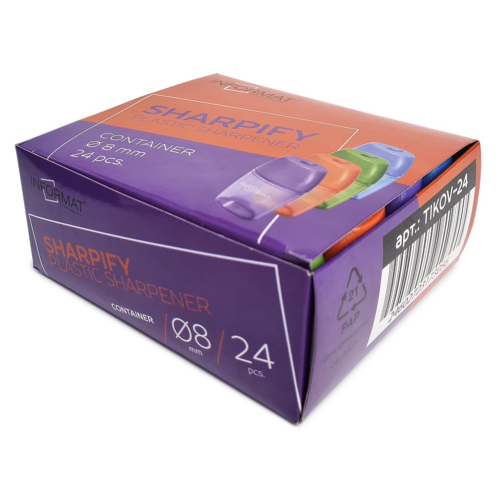 Цвет: ассорти Упаковка: дисплей Комплектация: с контейнером Наличие индивидуального штрих-кода: Да Форма: овальная Количество отверстий для заточки: 1 отверстие Мин. партия и варианты упаковок: 1 / 24 / 720 Точилка INFORMAT SHARPIFY с контейнером, ассорти, корпус пластик, 1 отверстие, в дисплее