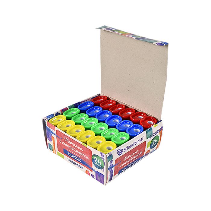 Цвет: ассорти Упаковка: дисплей Комплектация: с контейнером Наличие индивидуального штрих-кода: Да Форма: фигурная Количество отверстий для заточки: 1 отверстие Мин. партия и варианты упаковок: 1 / 24 / 720 -