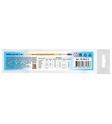 Количество в упаковке, шт: 3 Вид товаров: Набор кистей Ворс: белка Наличие европодвеса: Да Упаковка: пакет Комплектность набора кистей: № 1,2,3 круглые - белка Мин. партия и варианты упаковок: 1 / 40 -