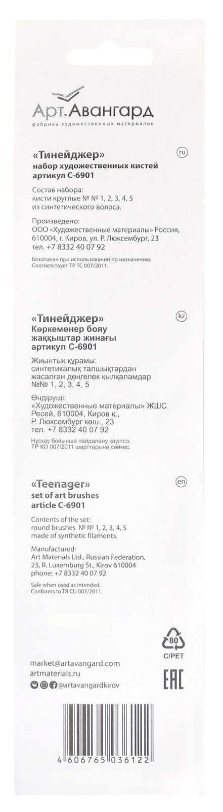 Количество в упаковке, шт: 5 Вид товаров: Набор кистей Ворс: синтетика Наличие европодвеса: Да Упаковка: блистер Комплектность набора кистей: № 1,2,3,4,5 круглые - синтетика Мин. партия и варианты упаковок: 1 / 5 / 200 Набор кистей 5 шт АртАвангард ТИНЕЙДЖЕР № 1,2,3,4,5 круглые - синтетика