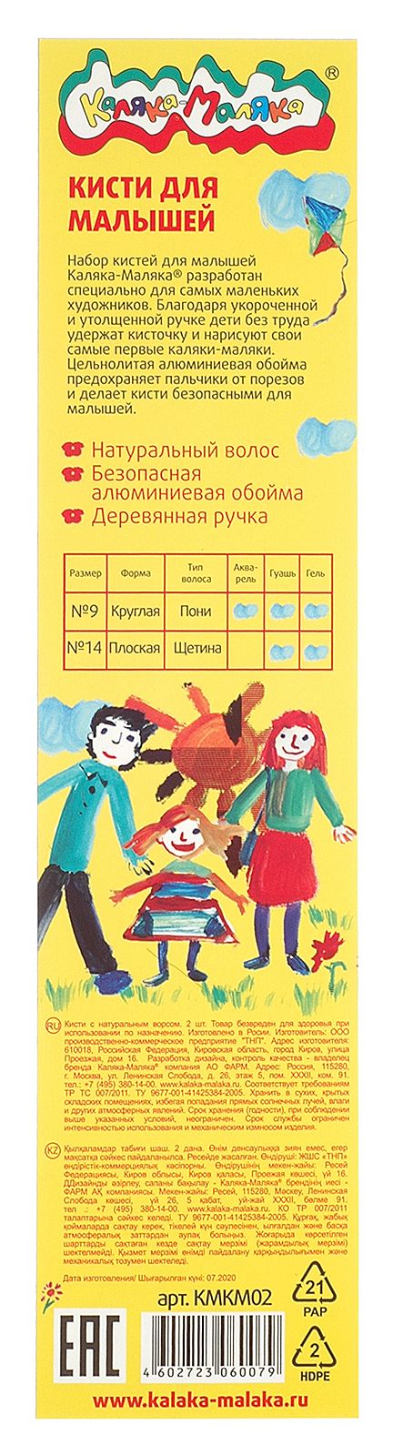 Количество в упаковке, шт: 2 Вид товаров: Набор кистей Ворс: пони, щетина Наличие европодвеса: Да Упаковка: пакет Комплектность набора кистей: № 9 круглая - пони, № 14 плоская - щетина Мин. партия и варианты упаковок: 1 / 20 / 400 Набор кистей 2 шт Каляка-Маляка № 9 круглая - пони, № 14 плоская - щетина