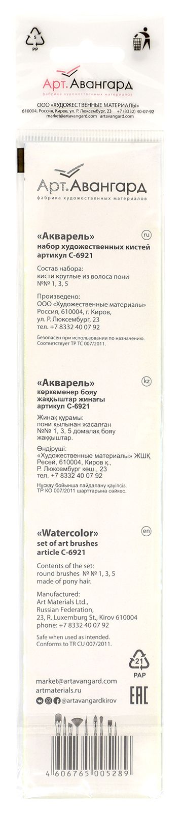 Количество в упаковке, шт: 3 Вид товаров: Набор кистей Ворс: пони Наличие европодвеса: Да Упаковка: пакет Комплектность набора кистей: № 1,3,5 круглые - пони Мин. партия и варианты упаковок: 1 / 20 / 500 Набор кистей 3 шт АртАвангард АКВАРЕЛЬ № 1,3,5 круглые - пони