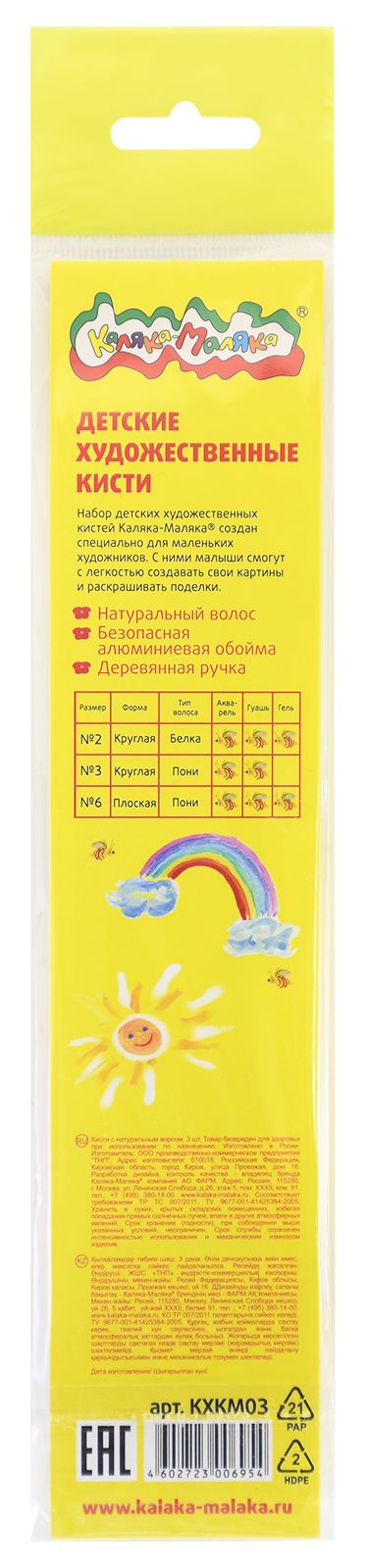 Количество в упаковке, шт: 3 Вид товаров: Набор кистей Ворс: белка, пони Наличие европодвеса: Да Упаковка: пакет Комплектность набора кистей: № 2 круглая - белка, № 3 круглая - пони, № 6 плоская - пони Мин. партия и варианты упаковок: 1 / 20 / 400 Набор кистей 3 шт Каляка-Маляка № 2 круглая - белка, № 3 круглая - пони, № 6 плоская - пони