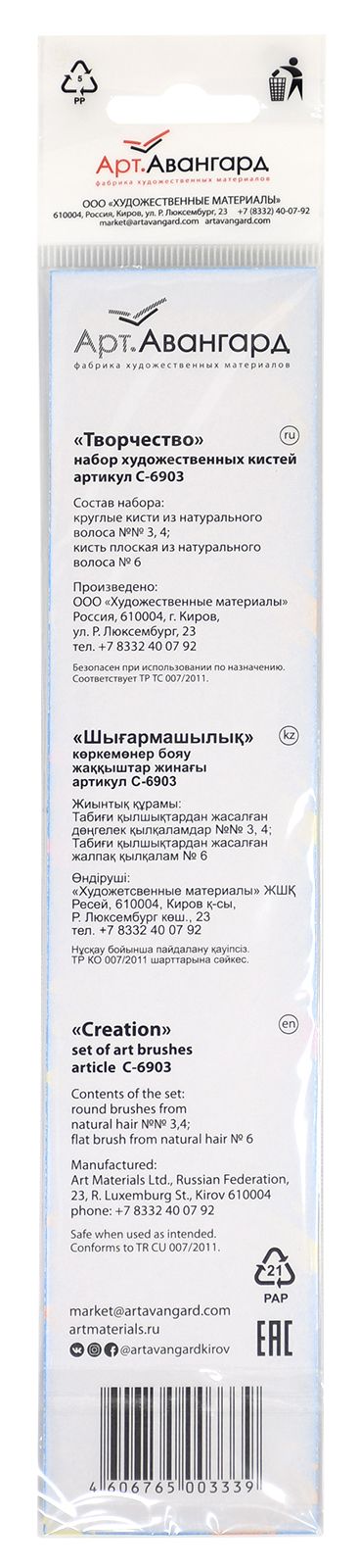 Количество в упаковке, шт: 3 Вид товаров: Набор кистей Ворс: белка, коза, пушно-меховая Наличие европодвеса: Да Упаковка: пакет Комплектность набора кистей: № 3 круглая - белка, № 4 круглая - коза, № 6 плоская - пушно-меховая Мин. партия и варианты упаковок: 1 / 20 / 500 Набор кистей 3 шт АртАвангард ТВОРЧЕСТВО № 3 круглая - белка, № 4 круглая - коза, № 6 плоская - пушно-меховая
