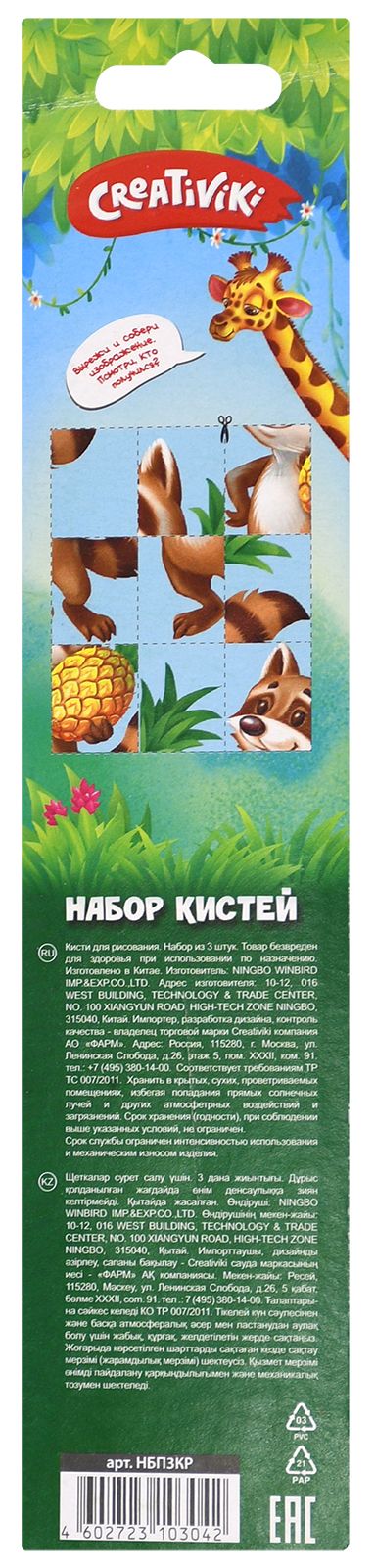 Количество в упаковке, шт: 3 Вид товаров: Набор кистей Ворс: белка Наличие европодвеса: Да Упаковка: пакет Комплектность набора кистей: № 1,2,3 круглые - белка Мин. партия и варианты упаковок: 1 / 40 Набор кистей 3 шт ЗВЕРЯТА № 1,2,3 круглые - белка
