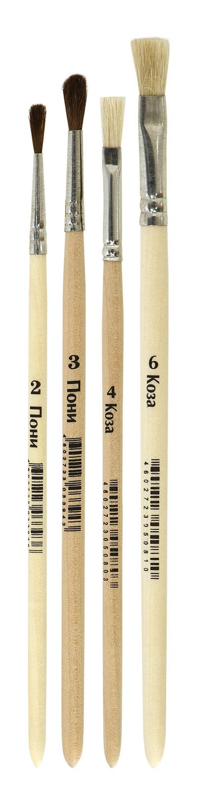 Количество в упаковке, шт: 4 Вид товаров: Набор кистей Ворс: пони, коза Наличие европодвеса: Да Упаковка: пакет Комплектность набора кистей: № 2,3 круглые - пони, № 4,6 плоские - коза Мин. партия и варианты упаковок: 1 / 50 / 400 -