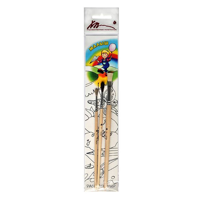 Состав набора Малыш: кисть круглая № 2 из натурального волоса (допустимо использование волоса козы, пушно-мехового сырья обрезной и сферической формы), кисть круглая № 3 из натурального волоса (допустимо использование волоса пони), кисть плоская № 6 из натурального волоса (допустимо использование волоса козы).Допустимы иные близкие по функциональным характеристикам виды волоса. Наименование конкретного вида волоса указывается на ручке кисти. Упаковка - блистер с европодвесом.