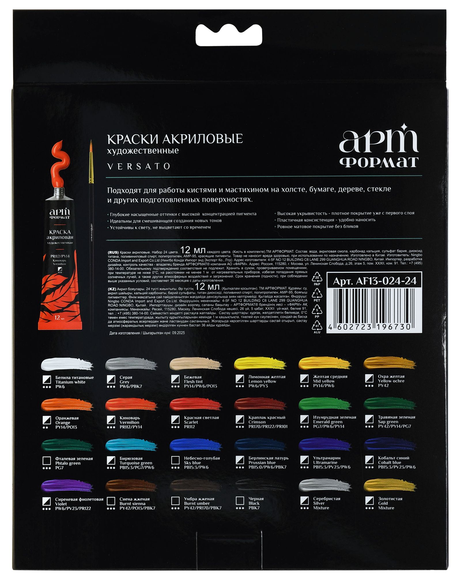 Объем, мл: 12 Количество цветов: 24 Наличие европодвеса: Да Цвет: ассорти Упаковка: коробка из микрогофрокартона Тип товара: художественные Мин. партия и варианты упаковок: 1 / 24 Краски акриловые художественные АРТформат VERSATO 24 цвета по 12 мл ассорти, коробка из микрогофрокартона с европодвесом