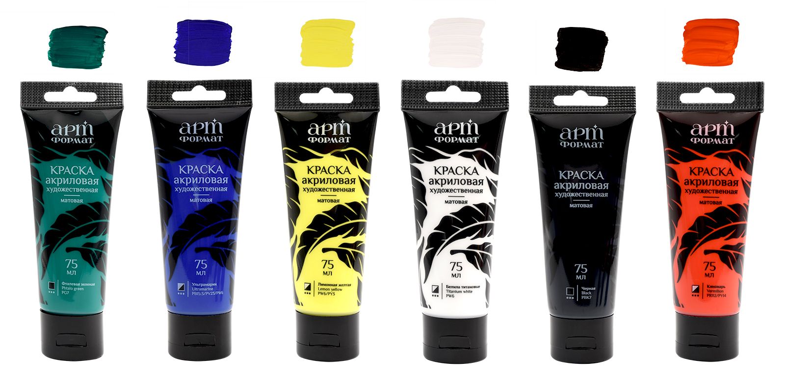 Объем, мл: 22 Количество цветов: 6 Наличие европодвеса: Нет Цвет: ассорти Упаковка: картонная упаковка Тип товара: художественные Мин. партия и варианты упаковок: 1 / 32 Краски акриловые художественные АРТформат 6 цветов по 22 мл ассорти