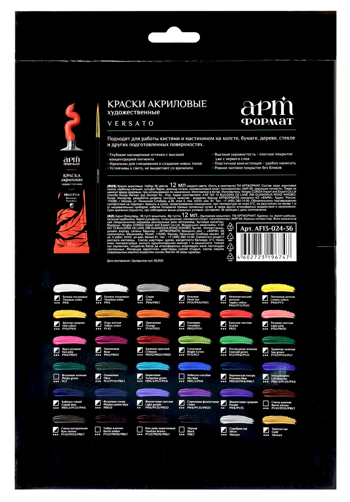 Объем, мл: 12 Количество цветов: 24 Наличие европодвеса: Да Цвет: ассорти Упаковка: коробка из микрогофрокартона Тип товара: художественные Мин. партия и варианты упаковок: 1 / 24 Краски акриловые художественные АРТформат VERSATO 24 цвета по 12 мл ассорти, коробка из микрогофрокартона с европодвесом