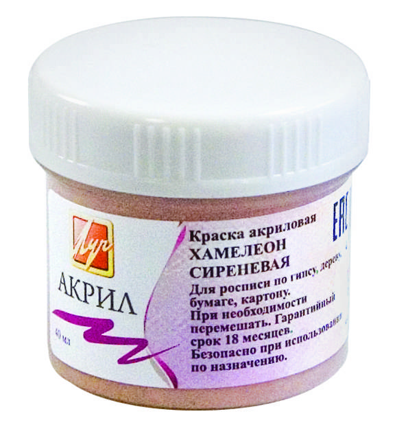 Краски акриловые "хамелеон" полупрозрачные, после высыхания не перекрывают фон полностью, а придают ему перламутровый переливающийся оттенок, который меняет свой цвет под разyыми углами зрения. Фасуются в баночки ёмкостью 40 мл.