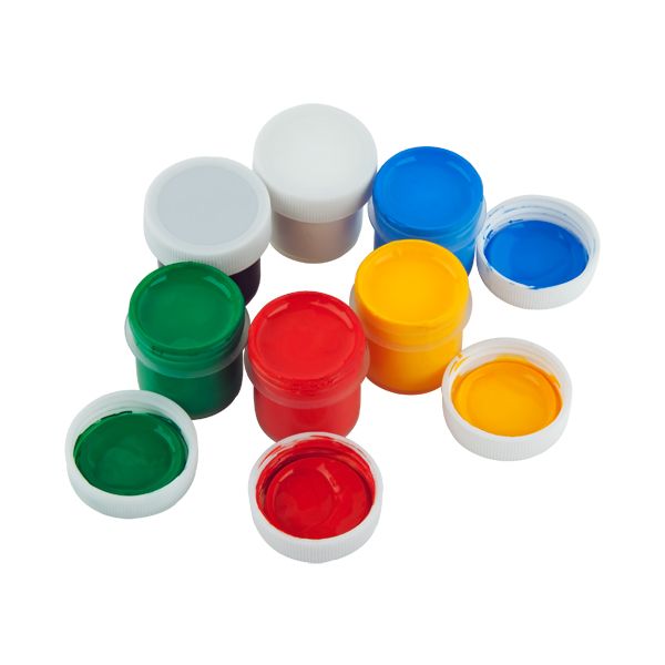 В набор входят: красная, желтая, зеленая, синяя, белая и черная краски.
