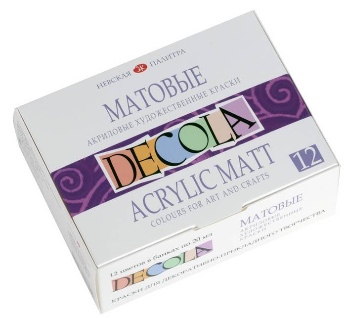 Матовые краски «Decola» на основе водной акриловой дисперсии легко наносятся на любую поверхность: бумагу, картон, грунтованный холст, дерево, металл, кожу и др.). Обладают высокой урывистостью, хорошо смешиваются, быстро высыхают. После высыхания приобретают матовую поверхность, не смываются водой. Могут быть использованы для росписи специализированных поверхностей таких как ткань, кожа, пластик, металл, стекло или керамика. Для профессионального уровня росписи сложных поверхностей - гибких как ткань или гладких как стекло - рекомендуется использовать продукцию специализированных серий «Decola», обладающих лучшей адгезией с заявленными поверхностями. При работе с впитывающими и цветными поверхностями (например, деревом) перед нанесением красочного слоя также рекомендуется предварительно загрунтовать изделие белым акриловым грунтом «Сонет» в 1-3 слоя с промежуточной сушкой. Храните краски плотно закрытыми. Кисти и инструменты сразу после работы промойте водой.