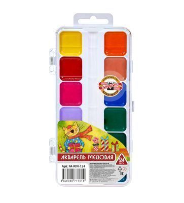 Количество цветов: 24 Наличие европодвеса: Да Упаковка: пластиковая упаковка Наличие кисти: без кисти Тип товара: детские Торговая марка: Koh-I-Noor Мин. партия и варианты упаковок: 1 / 12 Акварель Koh-I-Noor 24 цвета, без кисти, пластиковая упаковка с европодвесом