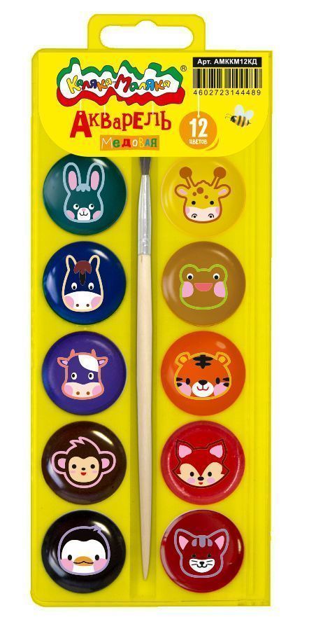 Акварель 12 цветов с кистью в ярком жёлтом пенале в эксклюзивном цвете Каляка-Маляка®! Каждая кювета украшена своим персонажем, чтобы ребенок мог запоминать цвета. Пленка защищает краски от перетекания и попадания пыли.