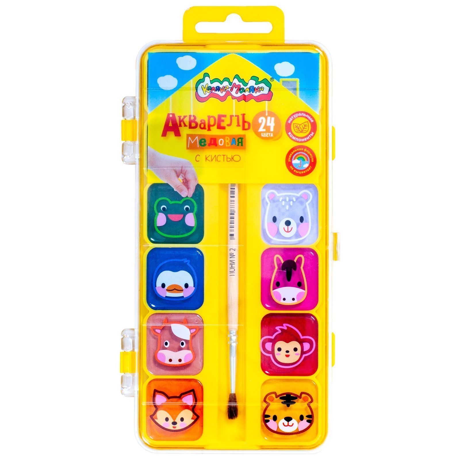 Акварель 24 цвета с кистью в ярком жёлтом пенале в эксклюзивном цвете Каляка-Маляка®! Каждая кювета украшена своим персонажем, чтобы ребенок мог запоминать цвета. Пленка защищает краски от перетекания и попадания пыли.