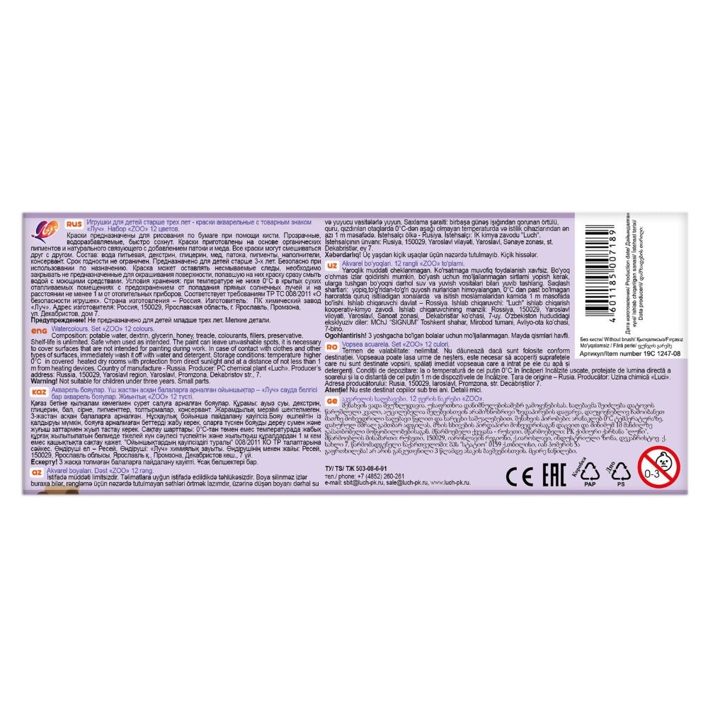 Краски акварельные серии ZOO выпускаются в картонной упаковке с пластмассовым вкладышем, без кисти. Срок годности не ограничен.