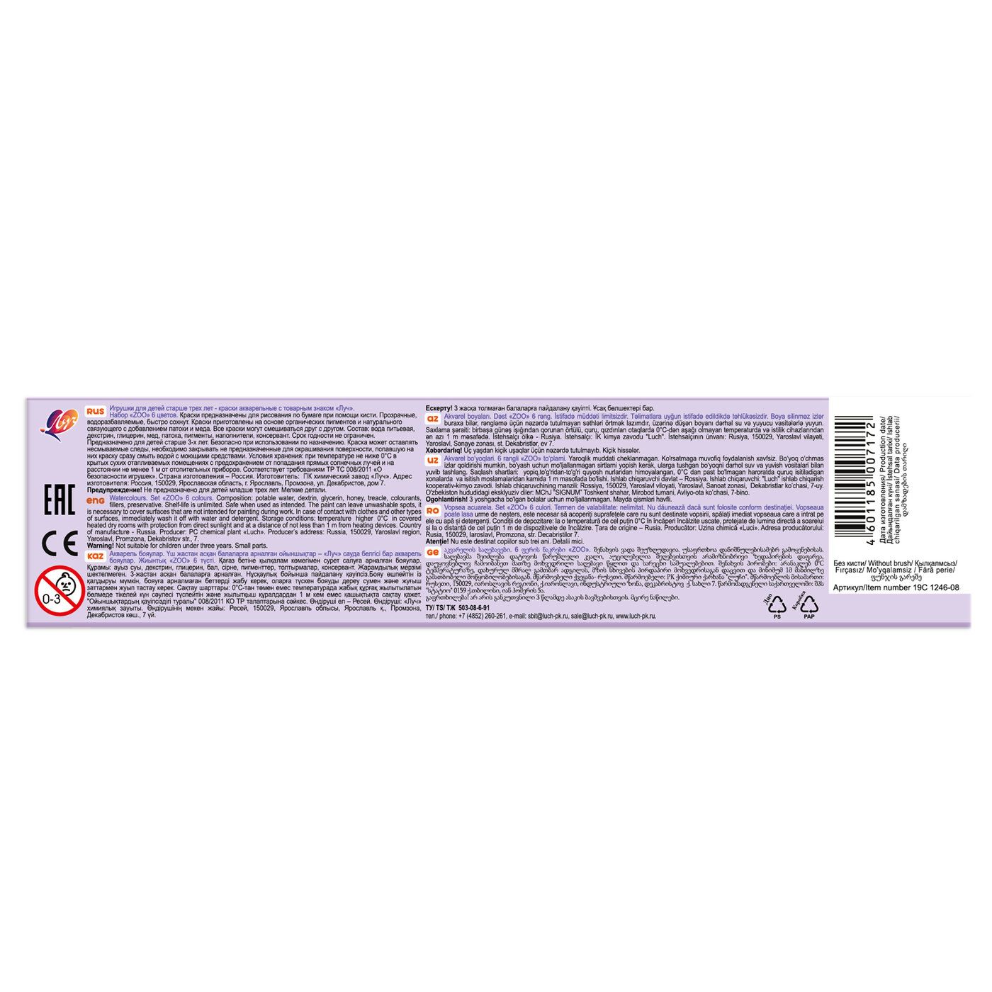 Краски акварельные серии ZOO выпускаются в картонной упаковке с пластмассовым вкладышем, без кисти. Срок годности не ограничен.