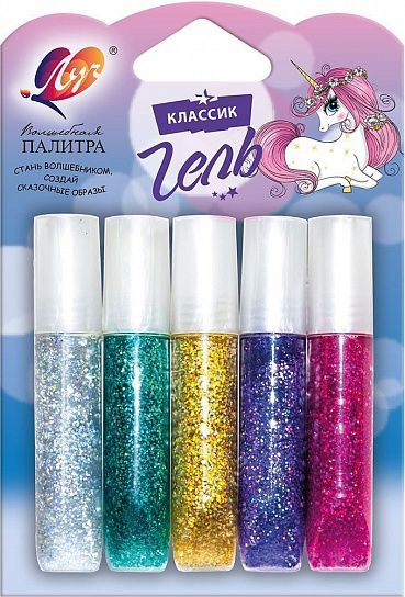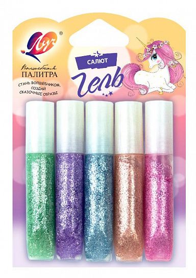 Цвет: ассорти Объем, мл: 5 Количество цветов: 5 Наличие европодвеса: Да Торговая марка: Луч Мин. партия и варианты упаковок: 1 Гель с блестками Луч ассорти 5 цветов по 5 мл с европодвесом