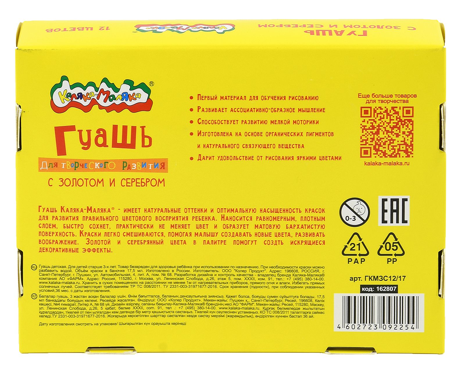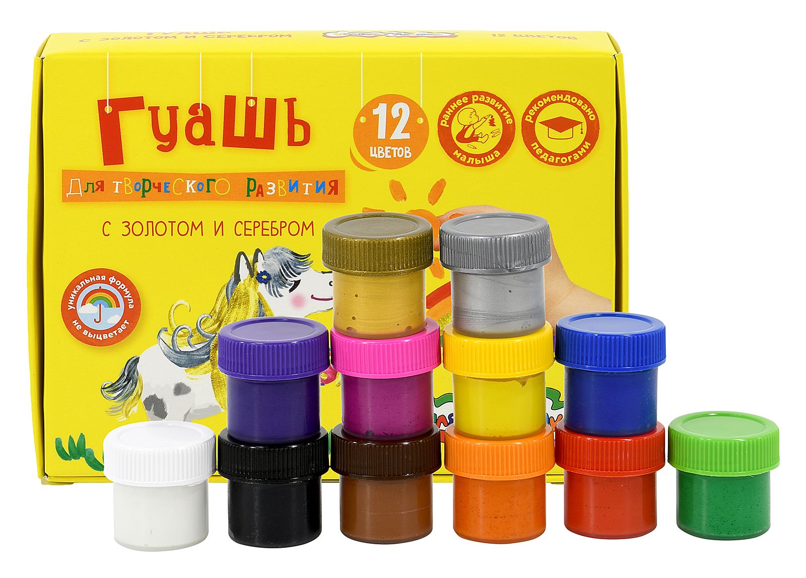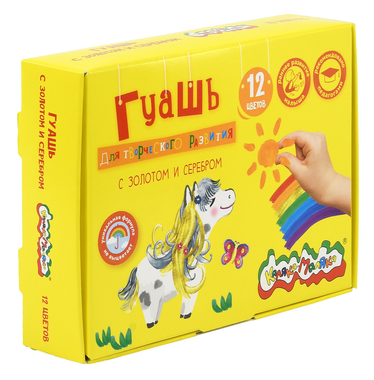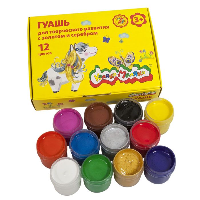 Количество цветов: 12 Спецэффекты: золото и серебро Тип товара: детские Емкость: набор баночек Цвет: ассорти Объем, мл: 17,50 Мин. партия и варианты упаковок: 1 / 12 Гуашь Каляка-Маляка 12 цветов по 17,5 мл ассорти, золото и серебро, набор баночек