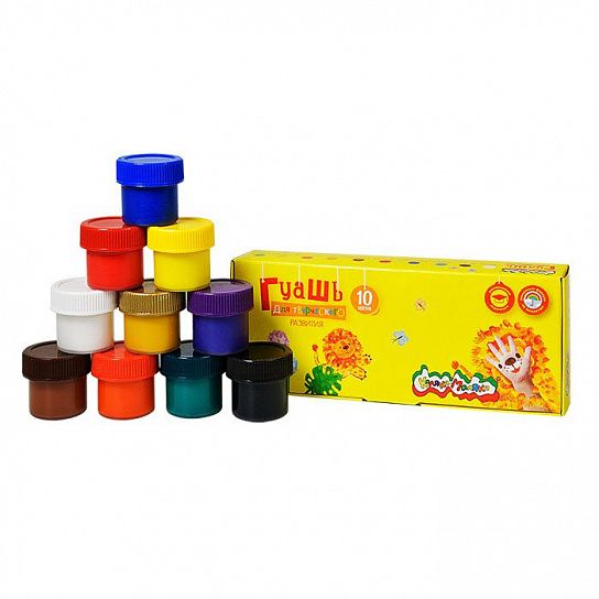 - Гуашь находится в пластиковых герметичных баночках с завинчивающейся цветной крышкой.