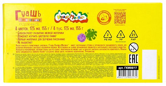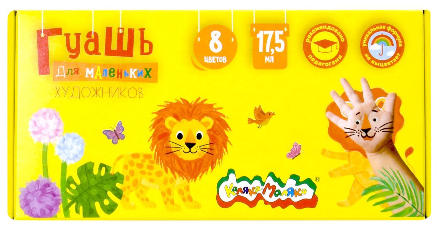Гуашь Каляка-Маляка® предназначена для детского творчества. Отлично подходит в качестве первого материала для обучения рисованию. Имеет оптимальное цветовое сочетание, обладает хорошей насыщенностью и чистотой тона. Отличается прекрасной кроющей способностью. При необходимости разбавляется водой.