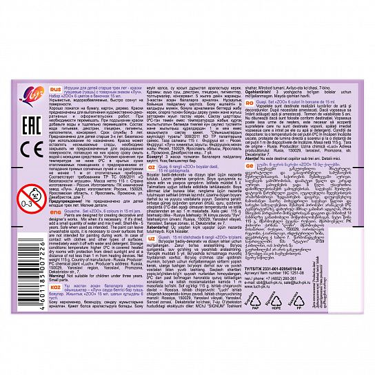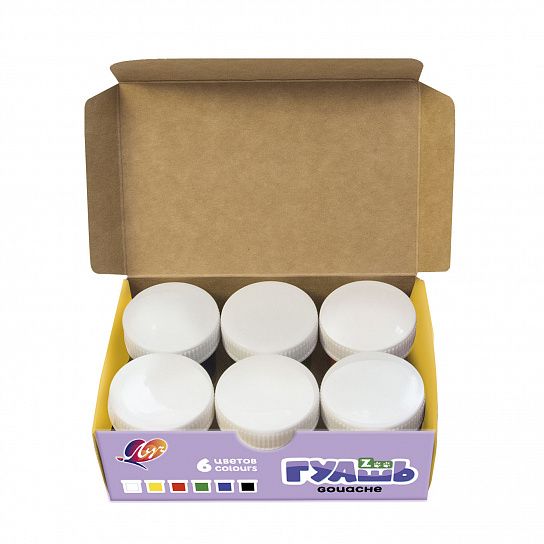 Краски гуашевые изготовлены на основе натуральных компонентов и высококачественных пигментов, находятся в пластмассовых баночках с завинчивающейся крышкой. Объём краски одного цвета 15 мл. Баночки с краской упакованы в цветную картонную коробку.