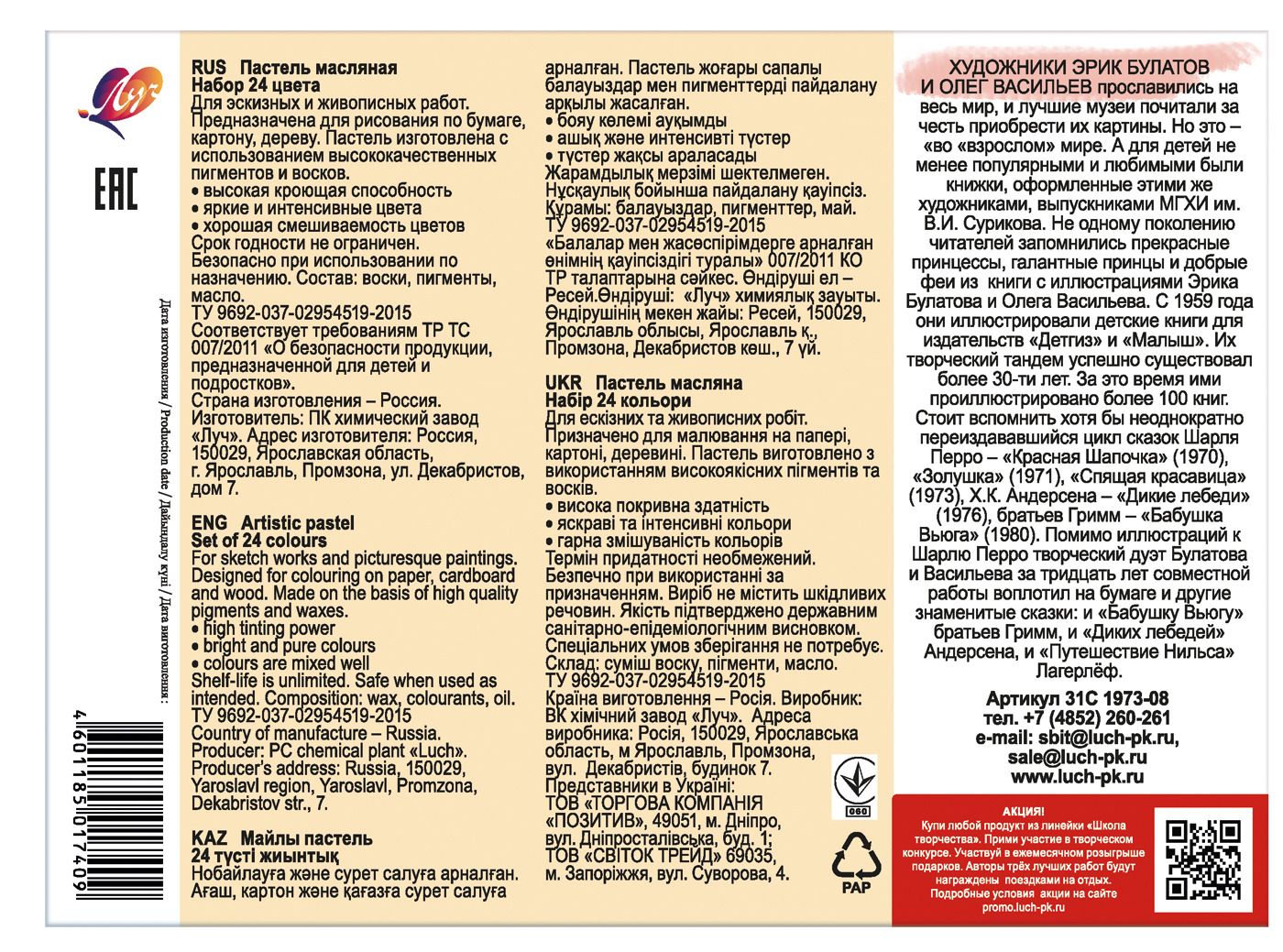Цвет: ассорти Длина, мм: 90 Количество цветов: 24 Вид товаров: Пастель художественная Упаковка: картонная упаковка Форма: треугольная Мин. партия и варианты упаковок: 1 / 12 Пастель художественная масляная Луч ШКОЛА ТВОРЧЕСТВА 24 цв. ассорти, треугольная в картонной упаковке