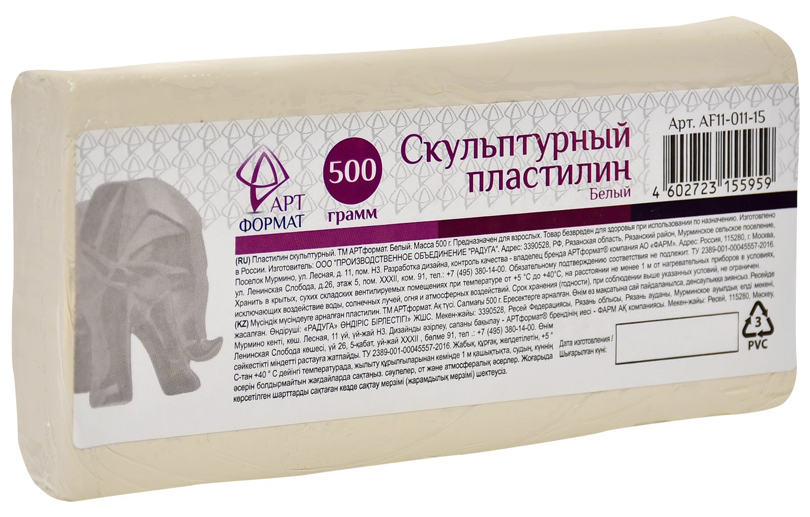 Цвет: белый Количество цветов: 1 Упаковка: пакет Вид материала для творчества: Пластилин скульптурный Вес, г: 500 Торговая марка: АРТформат Мин. партия и варианты упаковок: 1 / 12 -
