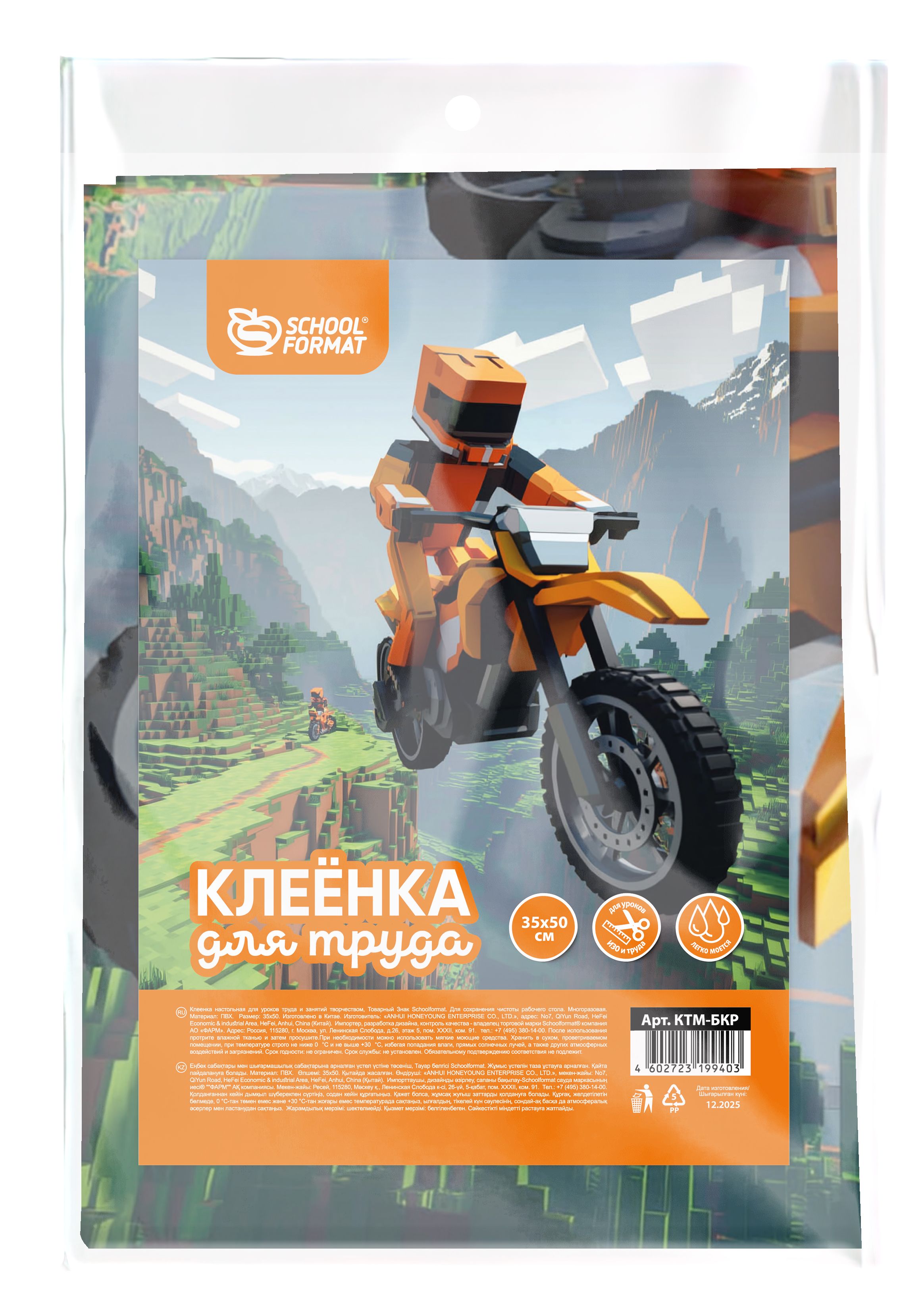 Толщина, мкм: 150 Упаковка: пакет с европодвесом Материал: ПВХ Пол ребенка: для мальчиков Серия: БАЙКРАФТ Цвет основной: зеленый, оранжевый Мин. партия и варианты упаковок: 1 / 50 / 500 Клеенка для уроков труда Schoolformat БАЙКРАФТ 35х50 см ПВХ, зеленая с оранжевым, для мальчиков